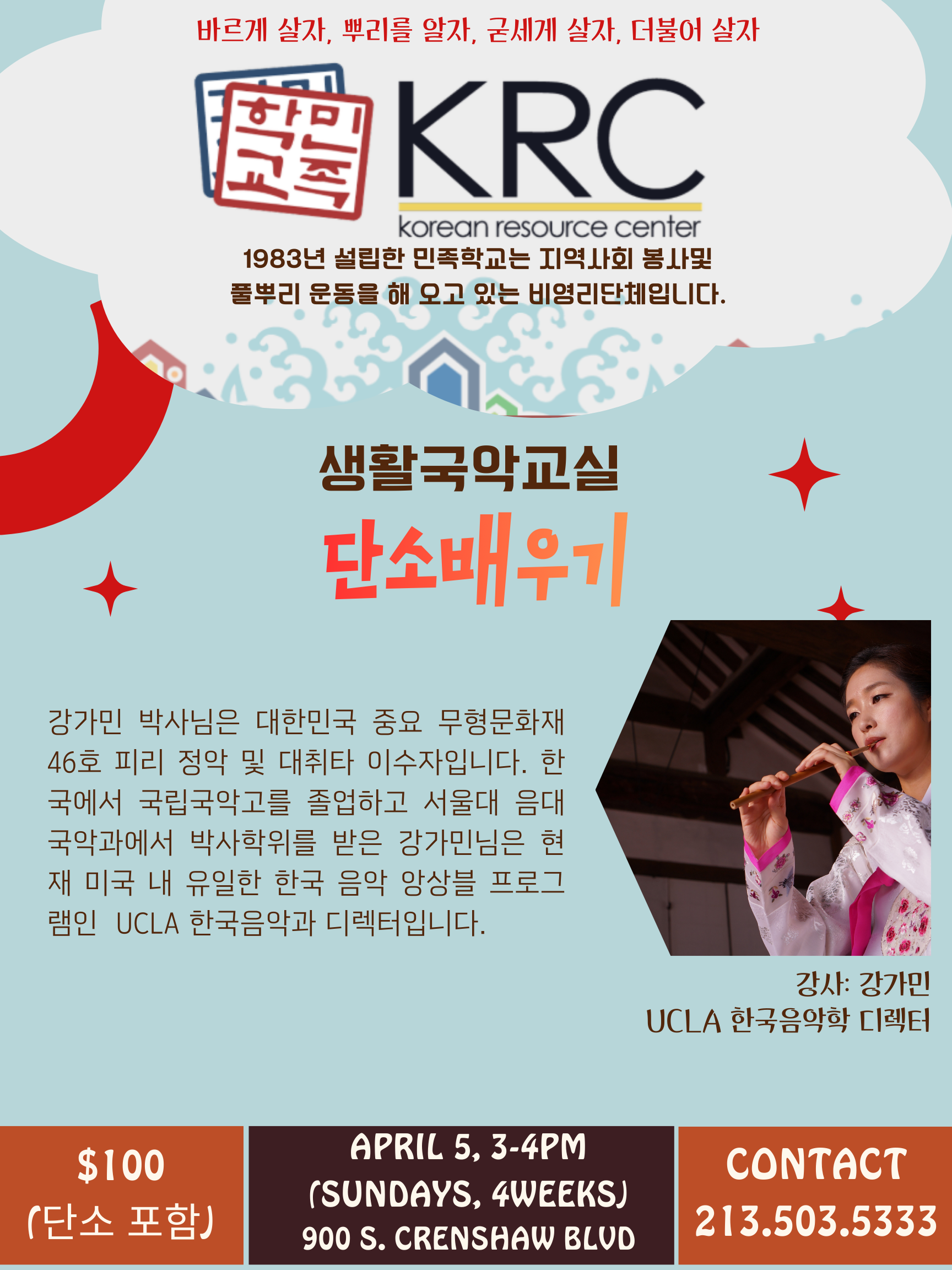 민족학교 생활 국악 교실에서 단소 (한국 전통 대나무 피리)를 함께 배워보세요!