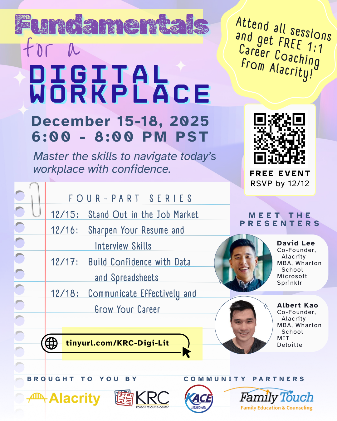Getting ready to step into the workforce? Join Alacrity and KRC for ๐๐ถ๐ฏ๐ฅ๐ข๐ฎ๐ฆ๐ฏ๐ต๐ข๐ญ๐ด ๐ง๐ฐ๐ณ ๐ข ๐๐ช๐จ๐ช๐ต๐ข๐ญ ๐๐ฐ๐ณ๐ฌ๐ฑ๐ญ๐ข๐ค๐ฆ, a 4-day workshop series designed to help you navigate the job market and build your career with confidence.
